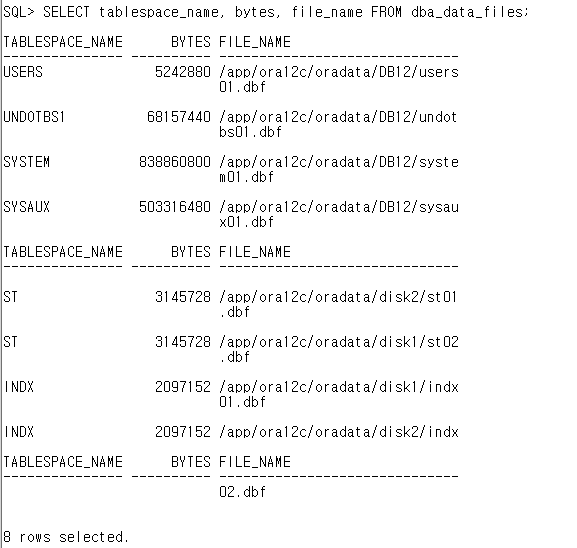 SELECT tablespace_name, bytes, file_name FROM dba_data_files;