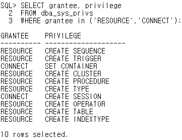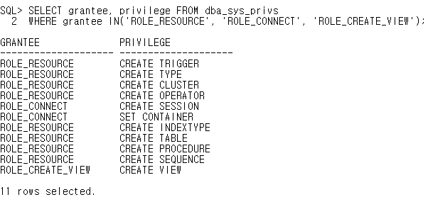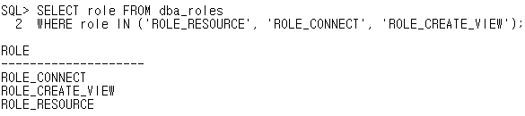 WHERE grantee IN('ROLE_RESOURCE', 'ROLE_CONNECT', 'ROLE_CREATE_VIEW');