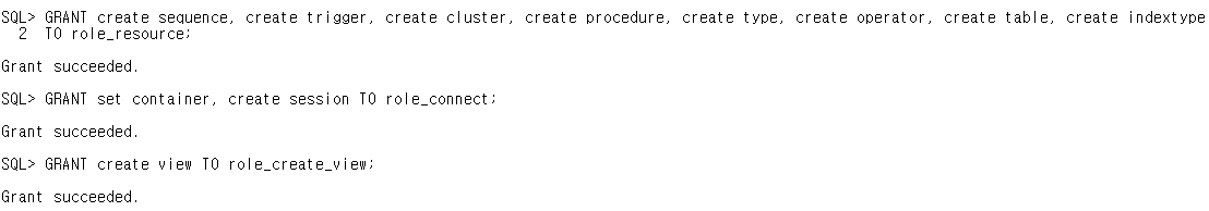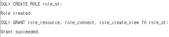 // 기존에 존재하는 resource, connect를 대체할 role_resource, role_connect의 이름으로 role과 create session 권한을 부여할 role_create_view; 생성