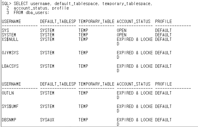 - default 또는 temporary 테이블스페이스 : 사용자의 기본 테이블스페이스나 임시 테이블스페이스 식별