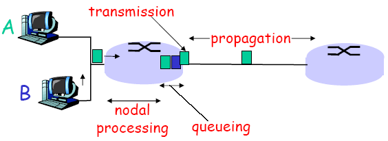- 처리 지연(processing), 큐잉 지연(queueing), 전송 지연(transmission), 전파 지연(propagation)의 4가지