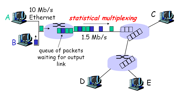 - 사용자들의 패킷은 네트워크 자원을 공유한다.(=사전 예약하지 않는다)