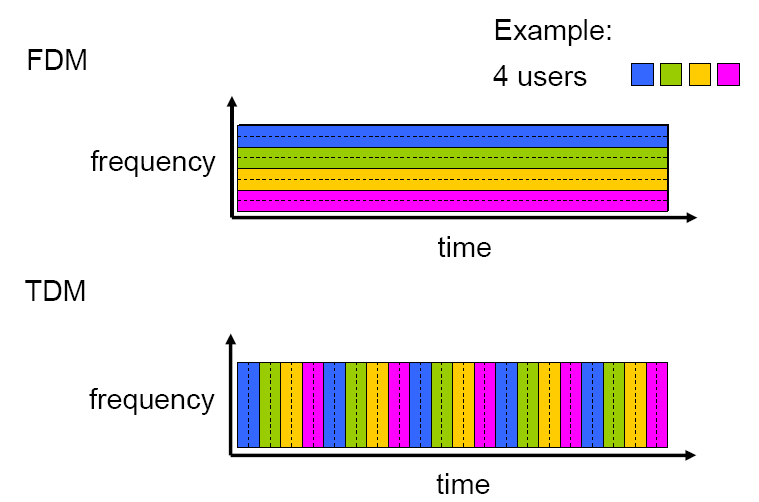 - 링크내의 회선은 주파수(대역폭)로 나누는 FDM(frequency division)과 시간으로 나누는TDM(time division)으로 구현