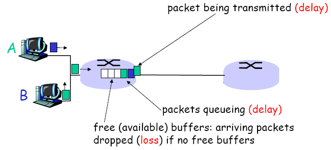 - 라우터에 들어오는 패킷량이 라우터가 전송 가능한 량을 초과한 경우, 라우터의 큐에서 처리순서를 기다리는 경우 지연과 손실이 발생