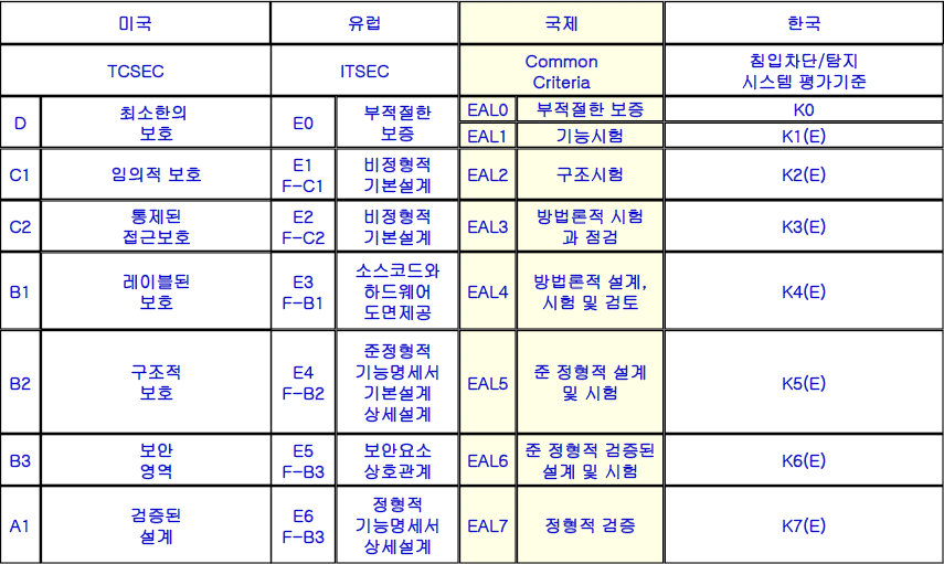 - 등급별 보안수준으로 EAL0부터 EAL7까지 구성