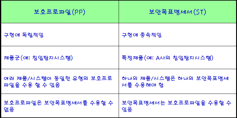 - CC의 기능과 보증 요구사항을 이용, 특정 제품(Target of Evaluation)의 구현과 상관없이 보안요구사항을 정의한 문서