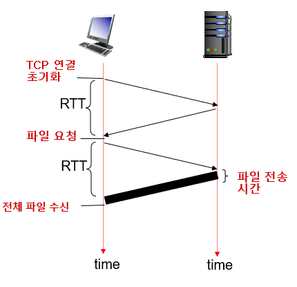 - non persistent http의 전송시간은 파일마다 2RTT + file trans time