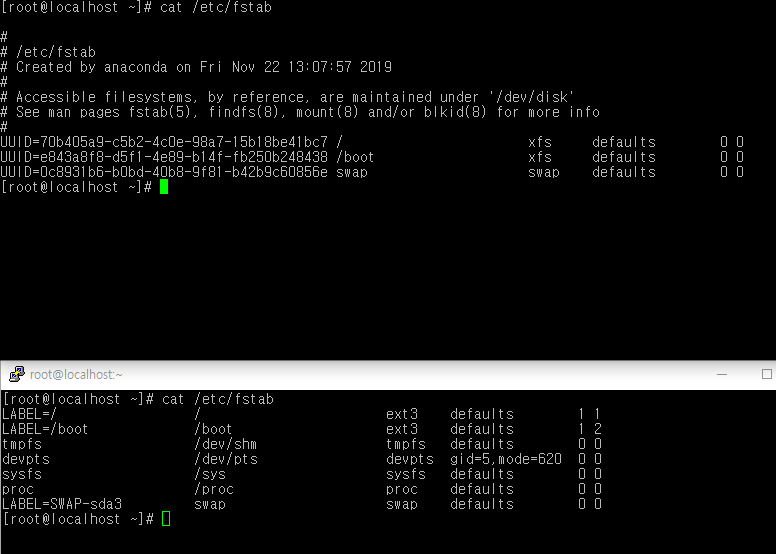 - /etc/fstab 파일은 시스템 시작 시 자동으로 마운트할 파일 시스템의 목록이나 옵션을 저장.