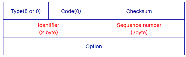 - checksum : ICMP 메세지 자체(헤더+데이터)에 대한 오류를 검사하는 field
