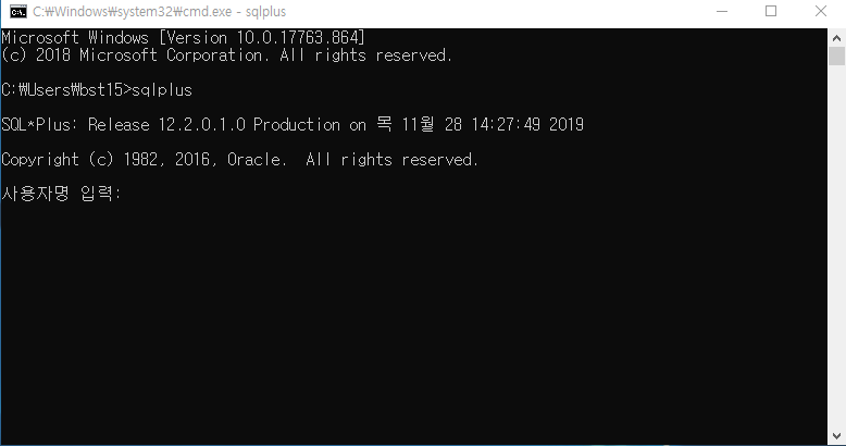 cmd 창에서 sqlplus를 입력했을때 이러한 화면이 뜬다면 성공적으로 설치 완료.