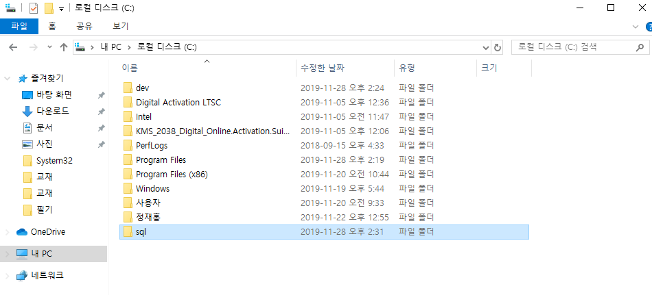 sql이라는 폴더를 새로 만든후(여러가지 파일이 계속 생성될것이기 때문에 따로 폴더 생성)