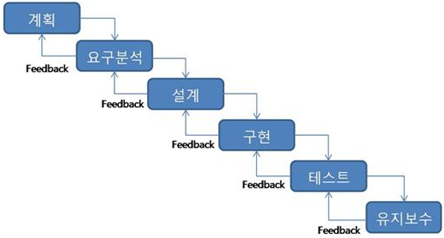 - 거슬러 올라갈 수 없는 폭포수와 같이 소프트웨어 개발도 각단계를 확실히 매듭짓고 다음 단계로 넘어간다는 의미