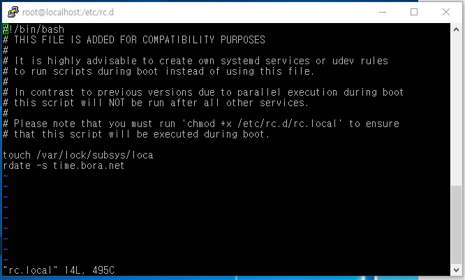 #vi rc.local -> rdate -s time.bora.net 입력 -> wq!