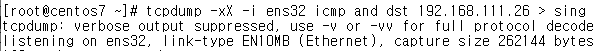 # tcpdump -xX -i ens32 icmp and dst 192.168.111.26 > sing1