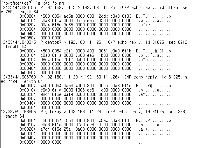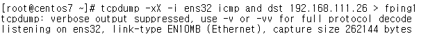 # tcpdump -xX -i ens32 icmp and dst 192.168.111.26 > fping1