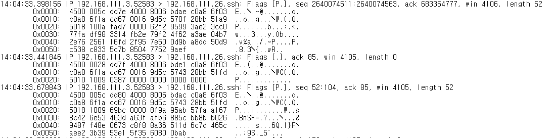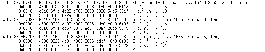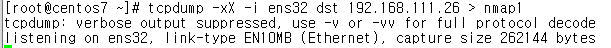 # tcpdump -xX -i ens32 dst 192.168.111.26 > nmap3