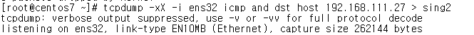 # tcpdump -xX -i ens32 icmp and dst host 192.168.111.27 > sing2