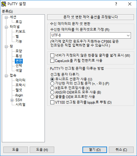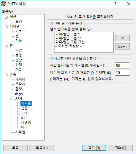 - 분류 -> SSH -> 키교환 -> 디피-헬만 그룹 1, 디피-헬만 그룹 14, 디피-헬만 그룹 교환 순서대로 설정