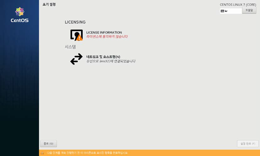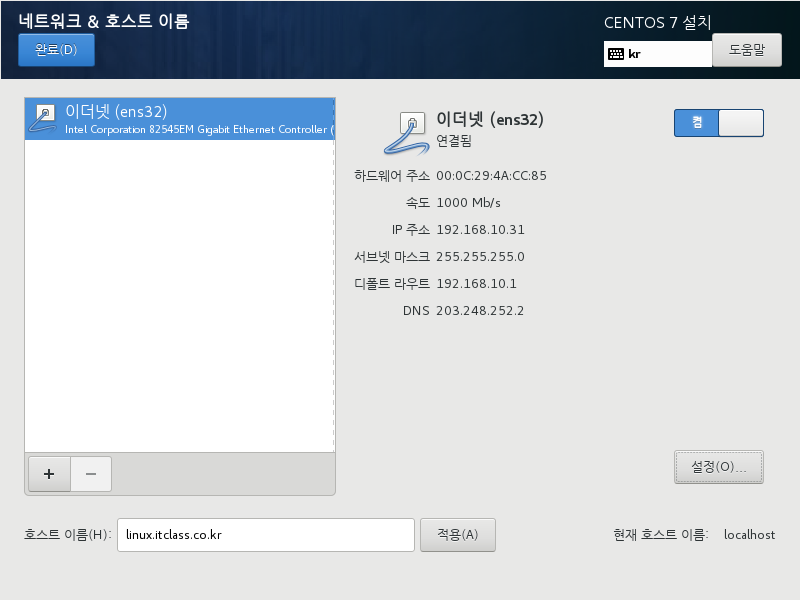 - 이더넷 설정 : 호스트 이름 CentOS7(기본값은 localhost)