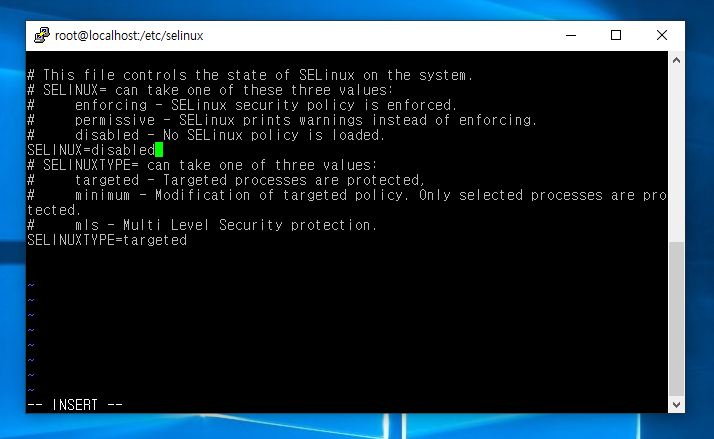 SELINUX=enforcing으로 되어있는 부분을 disabled로 변경 후에 시스템 리부팅