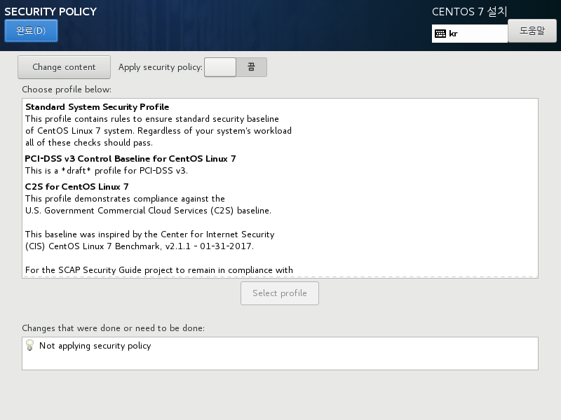 - Security 정책 설정 : 끔으로 변경