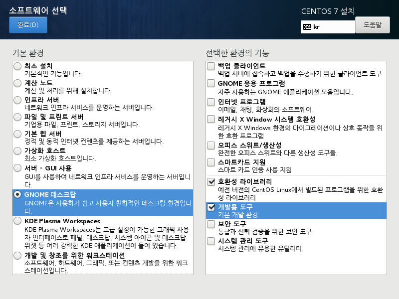 - 소프트웨어 선택 : GNOME 데스크탑 -> 호환성 라이브러리, 개발용 도구만 체크