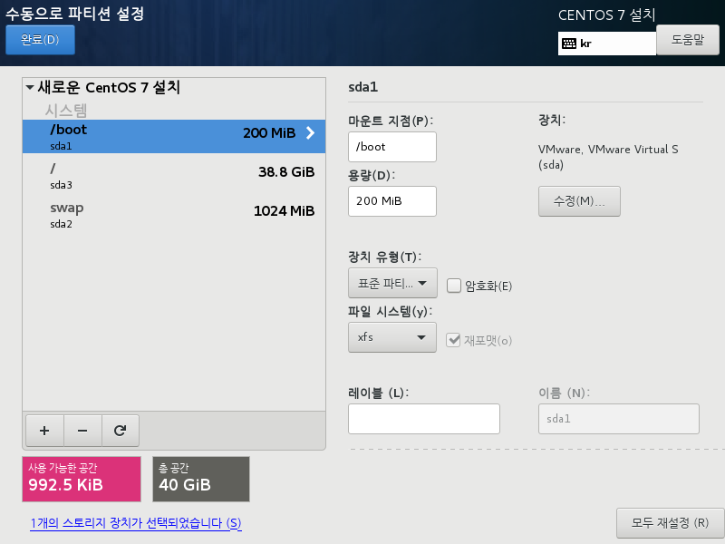 - 장치유형 : LVM -> 표준 파티션 변경 /boot : 200 swap : 1024 / : 아무것도 입력하지 않아도 됨