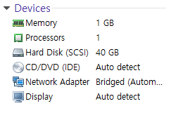 Edit Virtual machine settings에서 지울것 : 사운드카드, USB 컨트롤러, 프린트