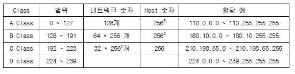- IP에는 Network ID(네트워크 정보)와 Host ID(컴퓨터 정보)가 포함되어 있음.