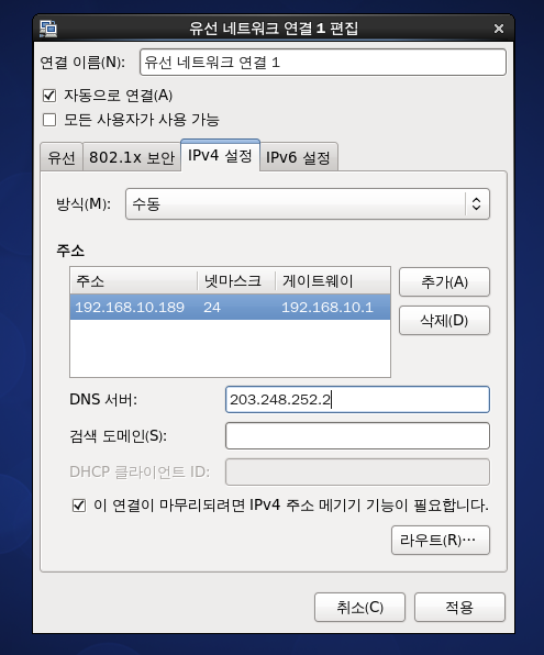 21. 네트워크 연결 -> 생성. 각자의 설정에 맞게 IP주소, 넷마스크, 게이트웨이, DNS 설정