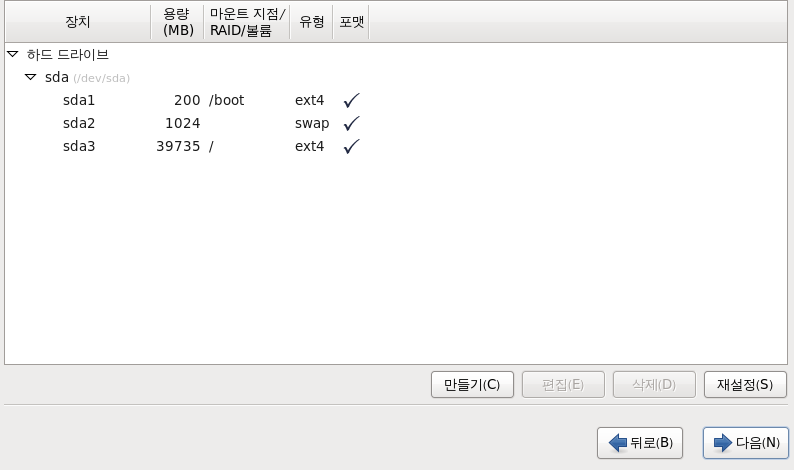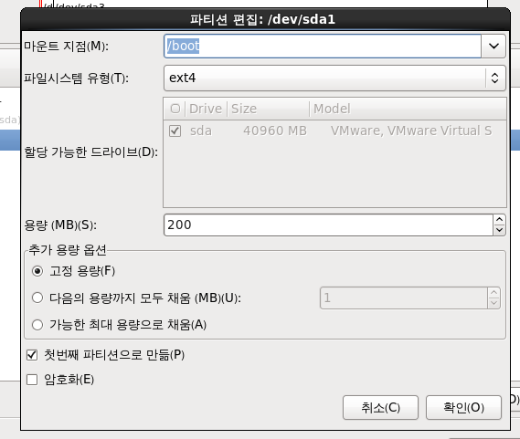 16. /boot은 200, swap은 1024, /은 나머지 전부의 크기로 파티션 설정. /boot는 첫 번째 파티션으로 만듦으로 설정.