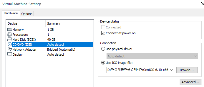 7. Edit Virtual machine settings에서 필요없는 디바이스 삭제, CD/DVD 드라이브 Use ISO Imagefile에 받아놓은 이미지 파일 투입. 고정 IP를 설정할 계획 이므로 네트워크 어댑터는 NAT에서 Bridge로 변경