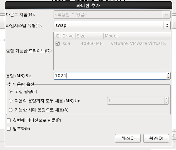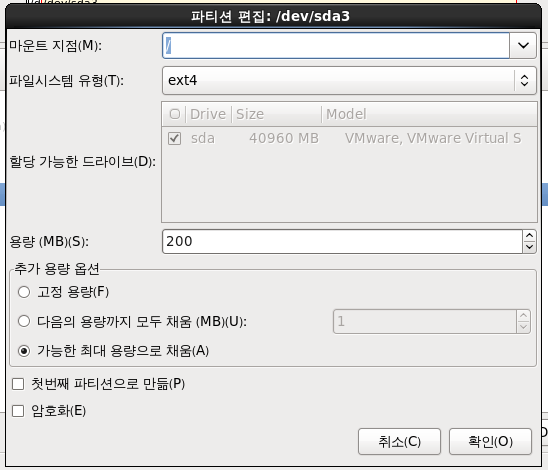 16. /boot은 200, swap은 1024, /은 나머지 전부의 크기로 파티션 설정. /boot는 첫 번째 파티션으로 만듦으로 설정.