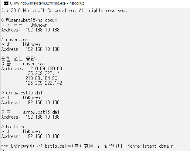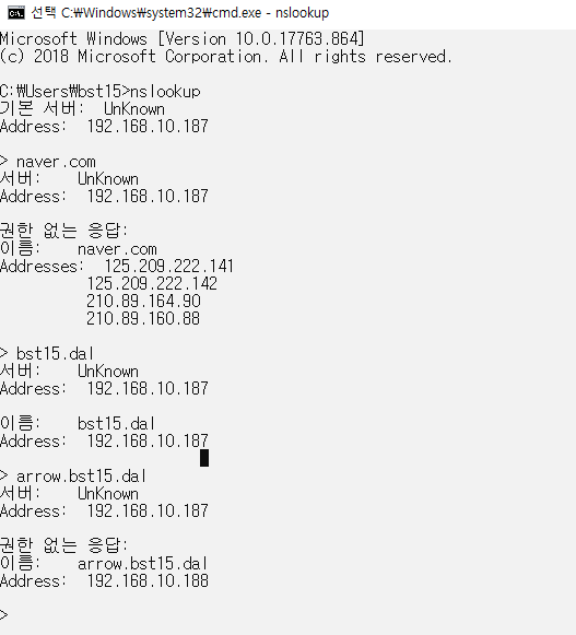 arrow.bst15.dal DNS 서버의 ip : 192.168.10.188(하위 도메인)