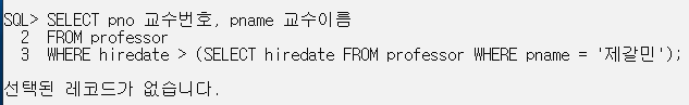 WHERE hiredate > (SELECT hiredate FROM professor WHERE pname = '제갈민');