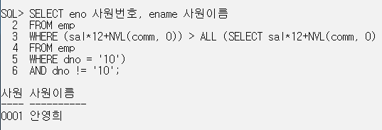 WHERE sal*12+NVL(comm, 0) > ALL (SELECT sal*12+NVL(comm, 0)