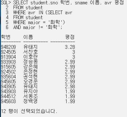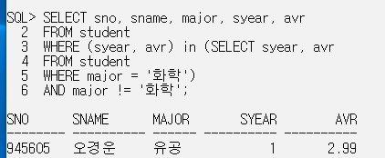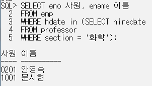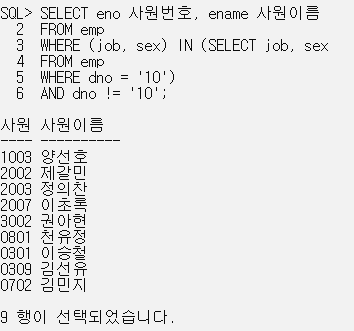 - WHERE절에 기술된 열의 숫자와 타입은 SELECT 절과 1:1 대응 관계가 되어야 한다.