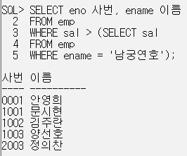 -> 남궁연호보다 급여를 많이 받는 사원을 검색. 괄호 친 서브 쿼리 문을 먼저 실행한 값으로 SELECT문을 실행한다.