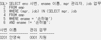 [예제 3]손하늘과 동일한 관리자의 관리를 받으면서 업무도 같은 사원을 검색