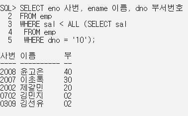 - 컬럼 < ANY : 단 한개의 값보다만 작으면 되기때문에 컬럼 < MAX( )