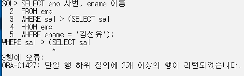 - 단일 행 연산자가 사용됨으로 반드시 서브 쿼리의 결과 값은 한 개만 검색