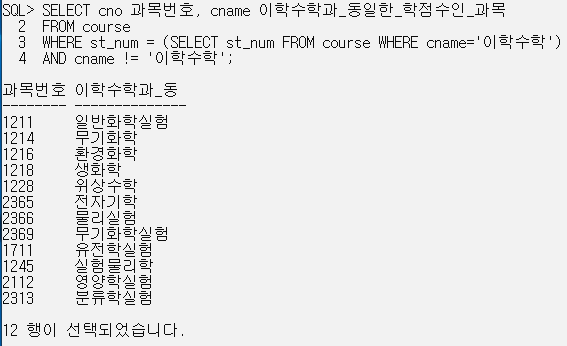 WHERE st_num = (SELECT st_num FROM course WHERE cname='이학수학')