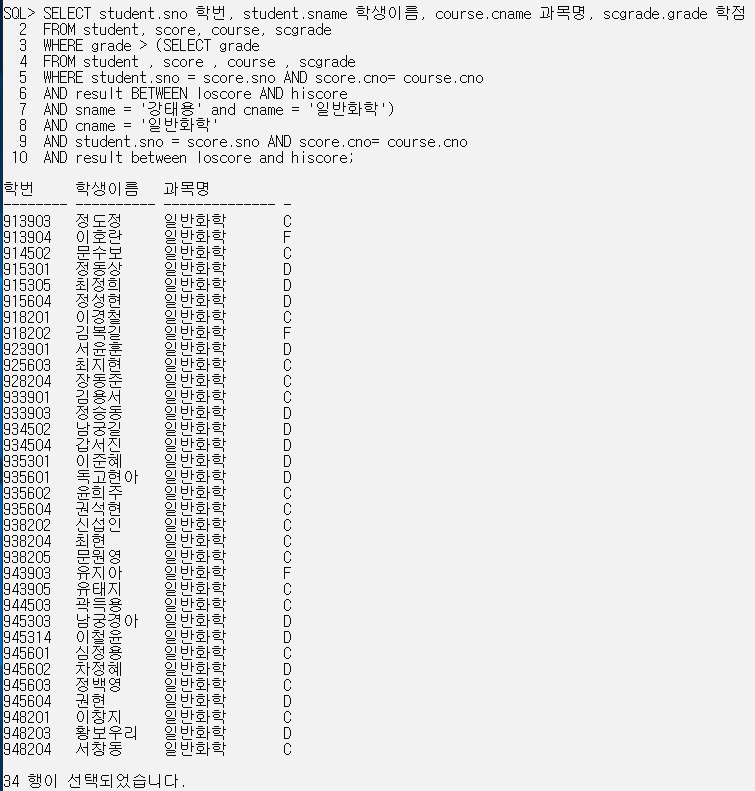 SELECT student.sno 학번, student.sname 학생이름, course.cname 과목명, scgrade.grade 학점