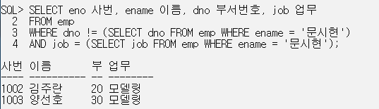 -> 문시현과 부서가 다르고, 동일한 업무를 하는 사원의 정보를 검색