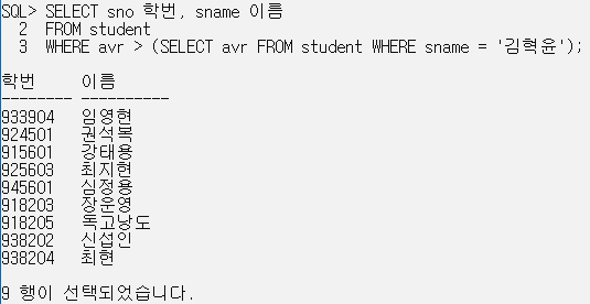 WHERE avr > (SELECT avr FROM student WHERE sname = '김혁윤');