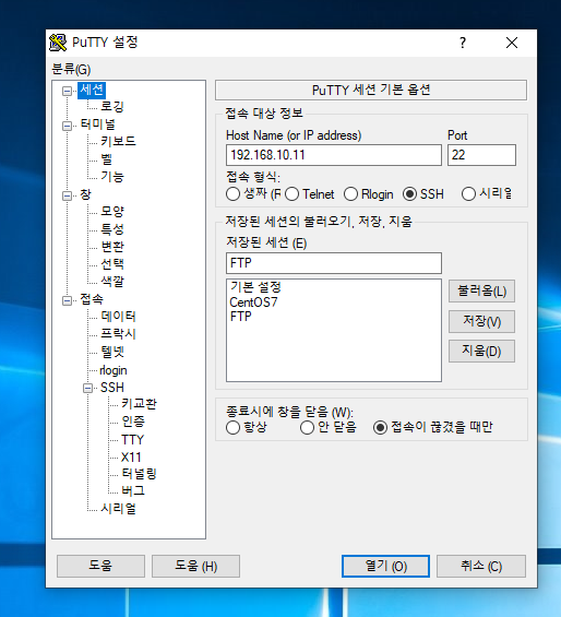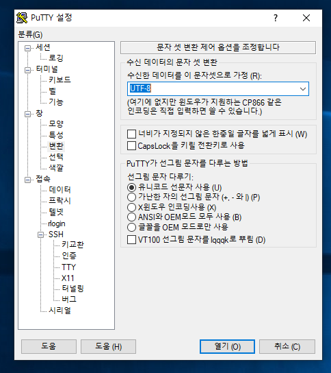 - 분류 -> SSH -> 키교환 -> 디피-헬만 그룹 1, 디피-헬만 그룹 14, 디피-헬만 그룹 교환 순서대로 설정