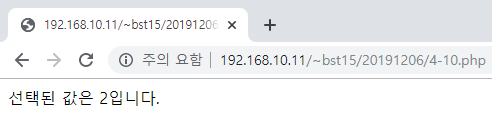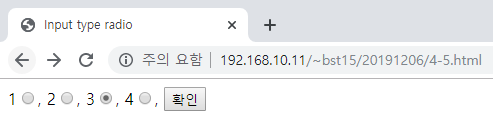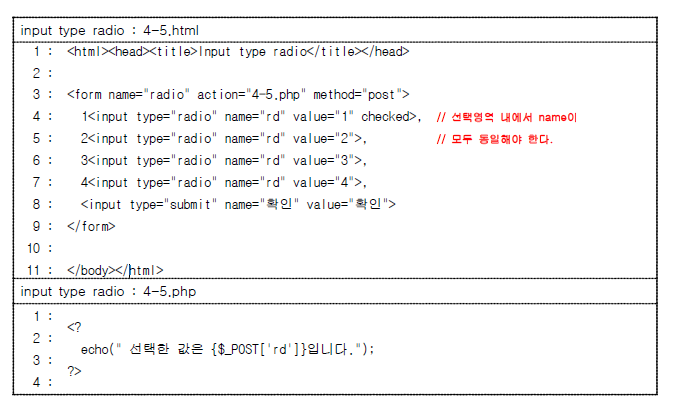 <input type = "radio" name = "전달 변수명" value = "전달될 값" [checked]>