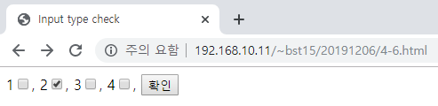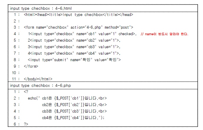 <input type = "checkbox" name = "전달 변수명" value = "전달될 값" [checked]>