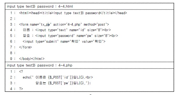 <input type = "text" || "password" name = "전달 변수명" maxlength="입력크기" size = "창크키" value = "미리 입력된 값">