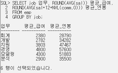 SELECT job 업무, ROUND(AVG(sal)) 평균_급여,